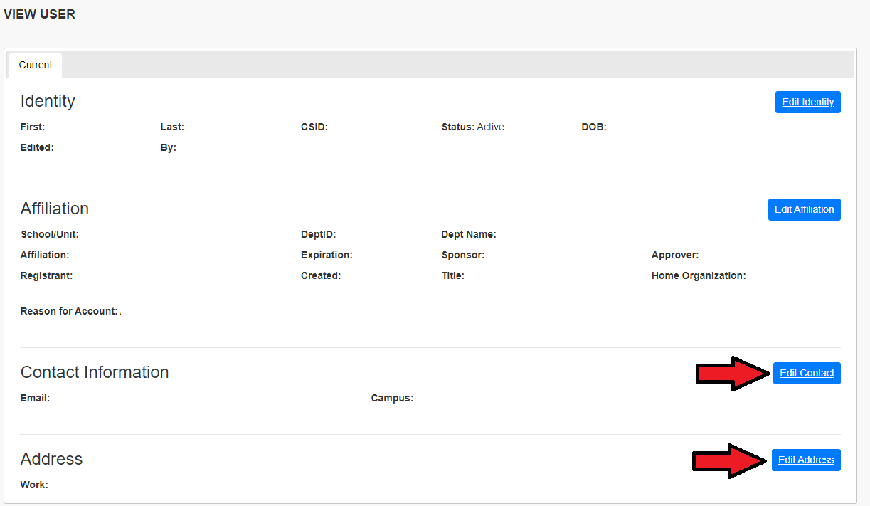 - Update the Expiration Date, Affiliations, Dept / School, and Sponsor and/or Approver as appropriate