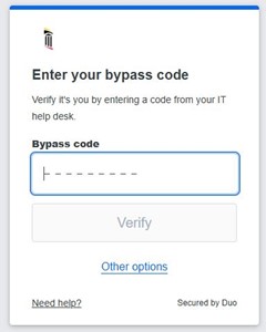 If you cannot use the Duo Mobile app on your smart phone or tablet now - because your phone is broken, the battery is dead, the phone is not with you, the app was uninstalled, etc. the ability to generate a bypass code is available.