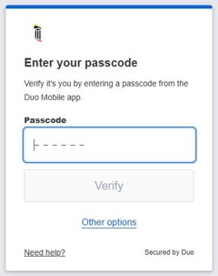 Log in using a passcode generated by the Duo Mobile app installed and activated on your Android or iOS device. Open Duo Mobile and tap it to generate a six-digit passcode. Enter that passcode into the space provided and click or tap Verify to log in to the application
