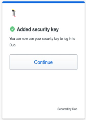 3. When you receive confirmation that you added your security key as a verification method click Continue.