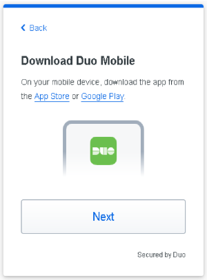 3. Download and install Duo Mobile on your phone or tablet from the Google Play Store or Apple App Store. Once you have Duo Mobile installed click Next.