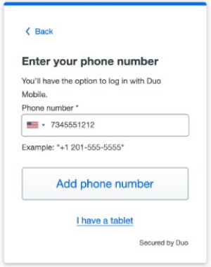 If you're going to use Duo Mobile on a tablet (like an iPad) with no phone service, don't enter a phone number and click I have a tablet instead.