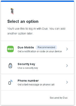 When a user attempts to log into any application which is protected by DUO, after their initial account setup, they will be presented with the following steps to setup their DUO account.