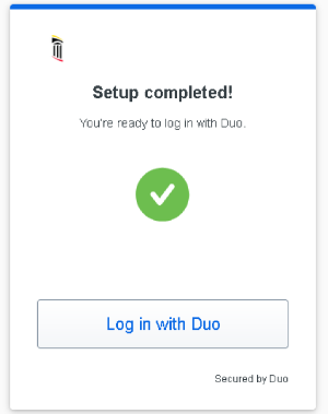 After you add a all login verification methods, or if you chose to skip it, you'll arrive at the end of the Duo setup process. Click Log in with Duo to log in to the application using the Duo method you just added.