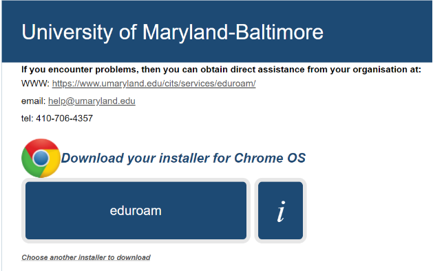 In a browser, go to https://cat.eduroam.org and click on the blue bar to start the process to download the installer. Select University of Maryland-Baltimore.