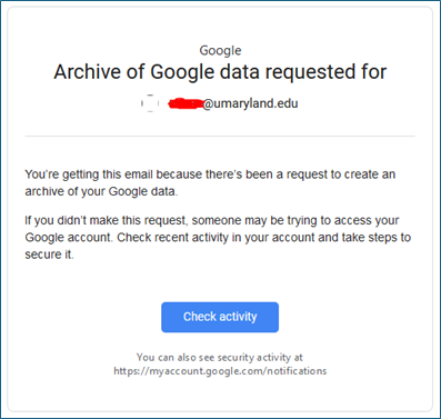 Google Takeout lets you export all your Google data, including data from Drive. This option is good if you have a lot of files or large files to download. Google will create a compressed file (.zip or .tgz) of all your Drive contents and let you know when it is ready to download. If you have a lot of files in Drive, Google may create multiple compressed files. Google Takeout also supports automatically copying the file to your personal Box, DropBox, or OneDrive account.