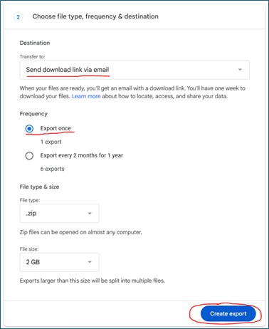 - Here, you can choose the destination of exported files (through email or other cloud file storage services), the frequency of exporting the data (once, or at recurring intervals), the format in which the downloaded data will be delivered (.zipand .tgz) and the maximum file size. After selecting the desired options, click on 'Create Export'.