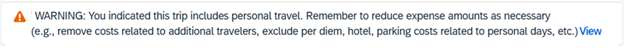 If personal travel was included, this must be indicated on the report header of the Travel Expense Report. Concur will then display a warning on necessary cost reductions: