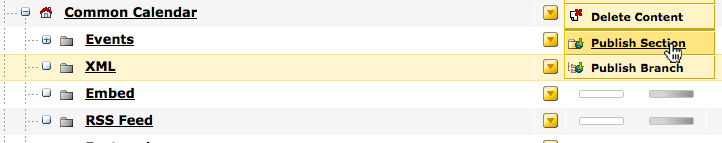 Simply hover over the yellow arrow next to the XML section and select "Publish Section." Doing this publishes all approved events in the entire calendar. Please note that it may take up to 10 minutes for your updates to appear on the live calendar.