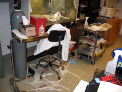 Routine maintenance in the laboratory must be improved. Chemicals and equipment that are not in use must be properly stored or disposed of. Walkways, benches, and active workspaces must free from obstructions. Ongoing experiments must be organized, labeled, and contained, leaving ample workspace for safe work practices.
