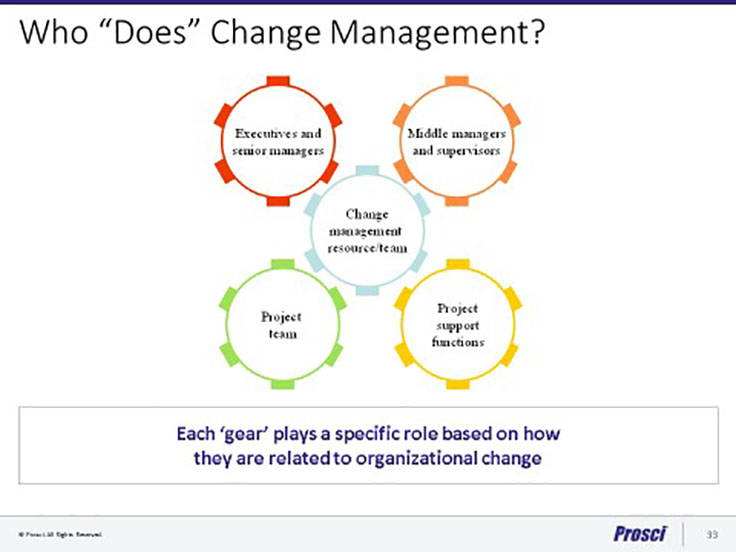 Change management efforts may be identified and designed by change management professionals, but they are executed by many people across the organization working toward the objectives of the change. It is the achievement of those objectives that is used to measure the effectiveness of the change management efforts.
