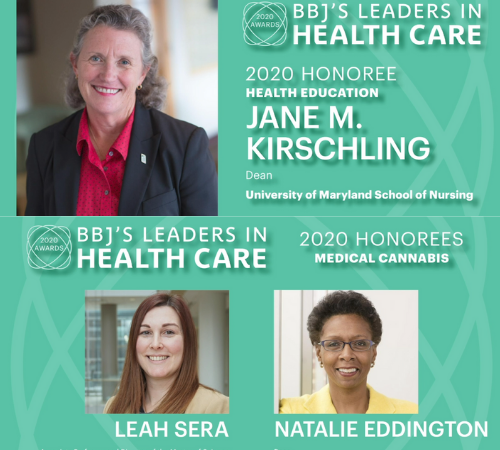 Originally the publication had intended to select seven honorees, but given the number of outstanding nominations, “it became clear that seven was not enough,” Pringle said. Instead, 17 leaders in health care were chosen, with three from the University of Maryland, Baltimore community among them: Jane M. Kirschling, PhD, RN, FAAN, dean of the University of Maryland School of Nursing (UMSON); Natalie D. Eddington, PhD, FCP, FAAPS, dean of the University of Maryland School of Pharmacy (UMSOP); and UMSOP’s Leah Sera, PharmD, MA, BCPS. Leaders in Health Care honorees were recognized in a Dec. 3 virtual ceremony during which the awards were announced by Kevin Carnell, health care practice leader, RCM&D.