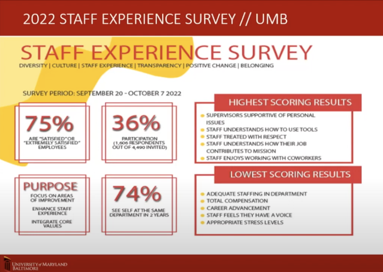 Overall, the Staff Experience Survey town hall demonstrated UMB’s unwavering commitment to its core values and its focus on enhancing the staff experience. By engaging in open dialogue, addressing concerns, and celebrating successes, the University is fostering a collaborative and supportive community where all members can thrive.