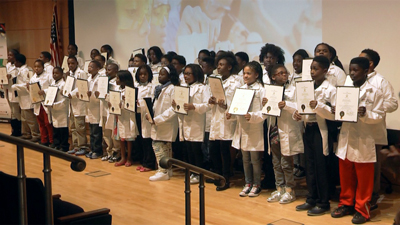 In a ceremony familiar to first-year medical students, the children walked to the front to receive their student lab coats from the UMB CURE leadership team and distinguished guests, inducting them into the society of student scientists and future clinicians. As part of the CURE Scholars Program, the children will work in a continuum of career development activities over the years. Their longitudinal track will start with two after-school sessions per week at the respective schools, in which they will engage in hands-on scientific laboratory activities and interact with researchers and graduate students. Students also will participate in a series of Saturday programs at UMB, which will include tutoring and recreational activities. The program also includes a six-week STEM summer camp at UMB.